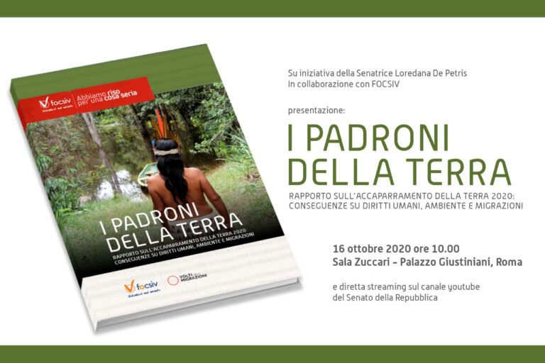 Su iniziativa della senatrice Loredana De Petris, Presidente del Gruppo Misto del Senato, in collaborazione con GCAP Italia, FOCSIV organizza il prossimo 16 ottobre la presentazione del terzo Rapporto sul land grabbing “I Padroni della Terra: Rapporto sull’accaparramento della terra 2020: conseguenze su diritti umani, ambiente e migrazioni“. L’evento si svolgerà presso la Sala Zuccari – Palazzo Giustiniani…